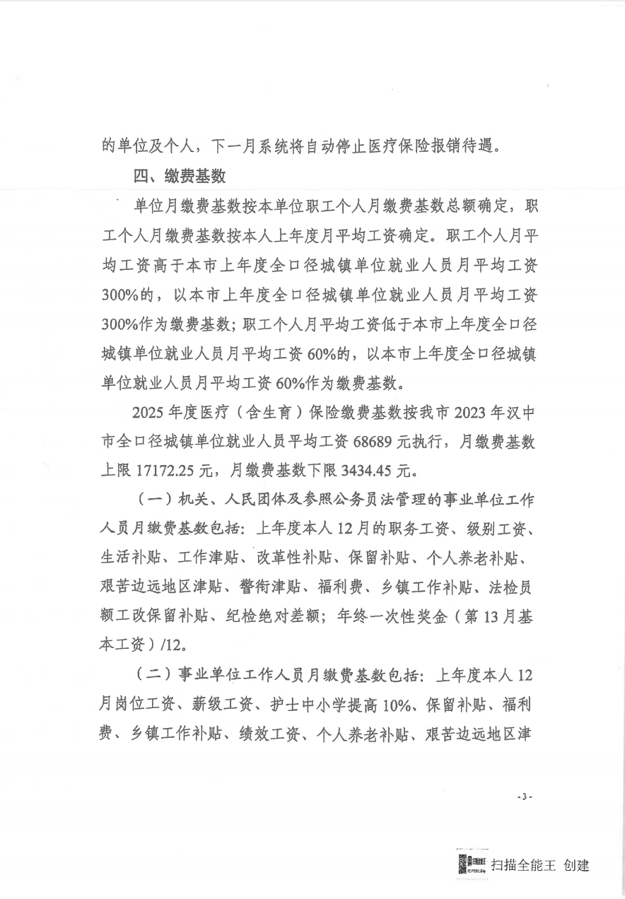 2025年度医疗(含生育)保险缴费基数按我市2023年汉中市全口径城镇单位就业人员平均工资68689元执行,月缴费基数上限17172.25元,月缴费基数下限3434.45元。