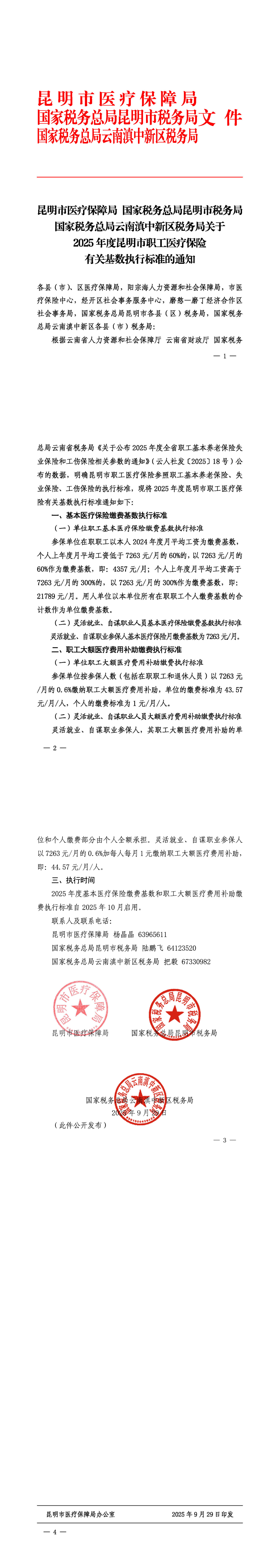 根据云南省人力资源和社会保障厅 云南省财政厅 国家税务总局云南省税务局《关于公布 2025 年度全省职工基本养老保险失业保险和工伤保险相关参数的通知》(云人社发〔2025〕18号)公布的数据,昆明市职工医疗保险参照职工基本养老保险、失业保险、工伤保险的执行标准,现将 2025 年度昆明市职工医疗保险有关基数执行标准通知如下: