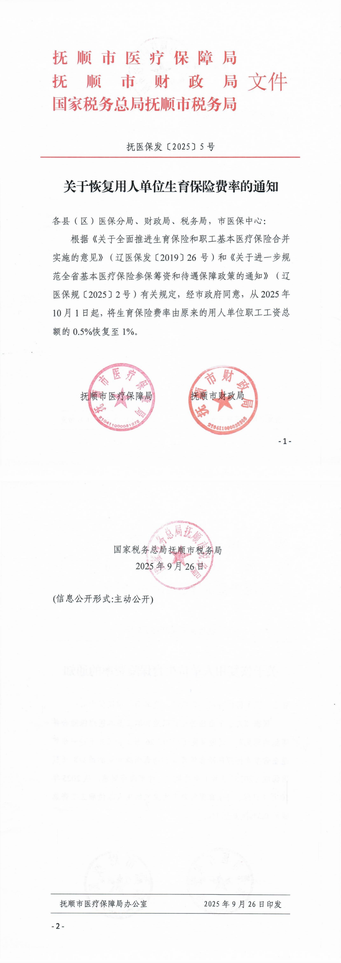 根据《关于全面推进生育保险和职工基本医疗保险合并 实施的意见》(辽医保发〔2019〕26号)和《关于进一步规 范全省基本医疗保险参保筹资和待遇保障政策的通知》(辽医保规〔2025〕2号)有关规定,经市政府同意,从2025年10月1日起,将生育保险费率由原来的用人单位职工工资总额的0.5%恢复至1%。