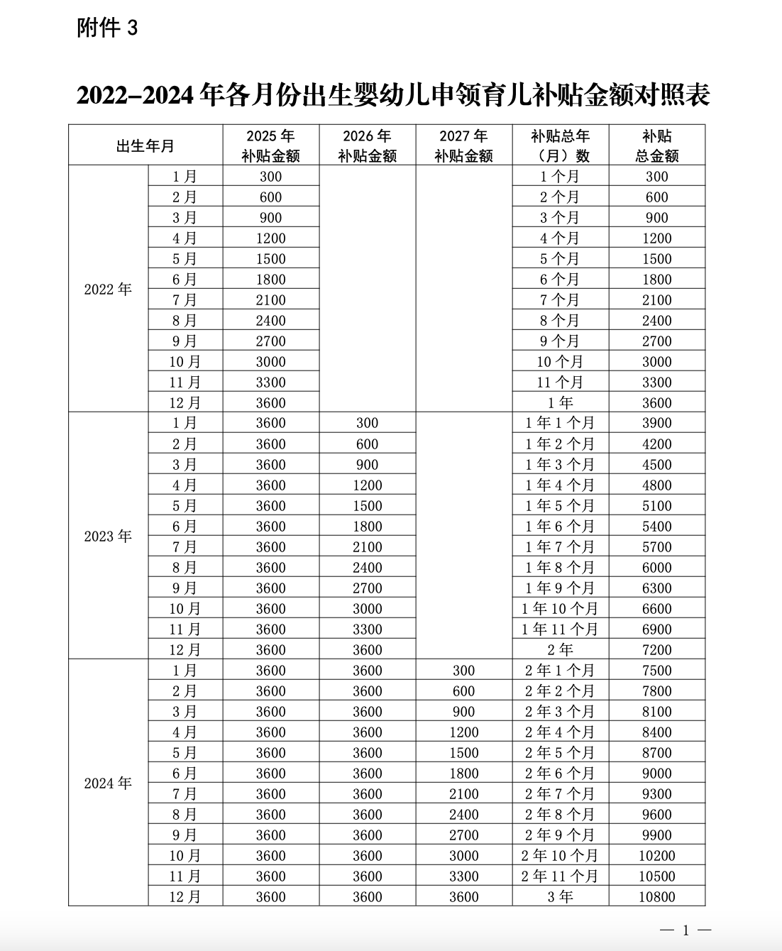 3.2022-2024 年各月份出生婴幼儿申领育儿补贴金额对照表