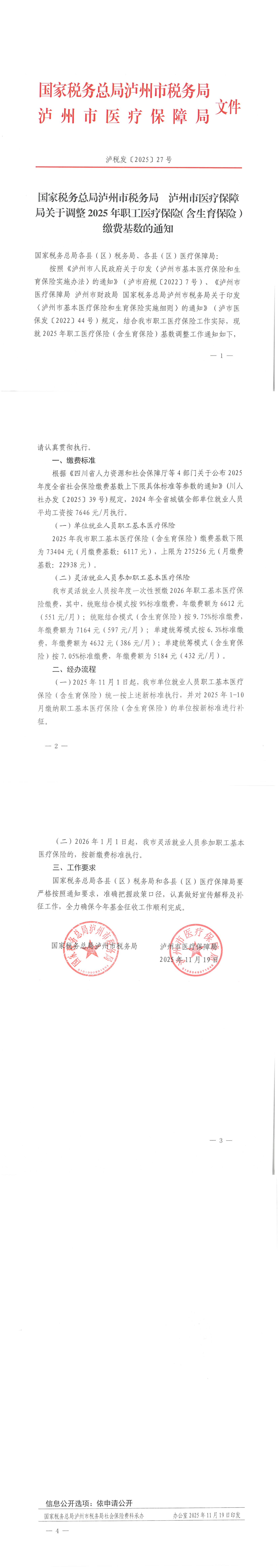信息公开选项:依申请公开国家税务总局泸州市税务局社会保险费科承办办公室 2025 年 11 月 19 日印发