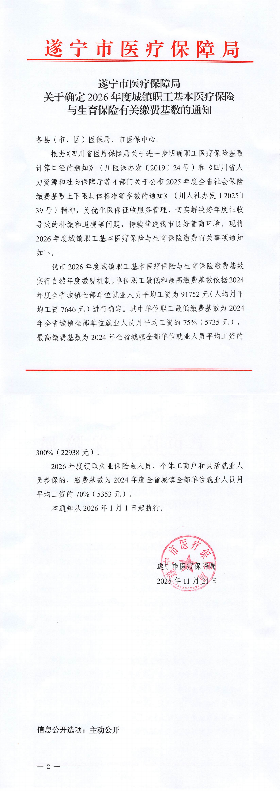根据《四川省医疗保障局关于进一步明确职工医疗保险基数计算口径的通知》(川医保办发〔2019〕24号)和《四川省人 力资源和社会保障厅等4部门关于公布2025年度全省社会保险 缴费基数上下限具体标准等参数的通知》(川人社办发〔2025〕39号)精神,为优化医保征收服务管理,切实解决跨年度征收导致的补缴和退费等问题,持续营造我市良好营商环境,现将 2026年度城镇职工基本医疗保险与生育保险缴费有关事项通知 如下。
