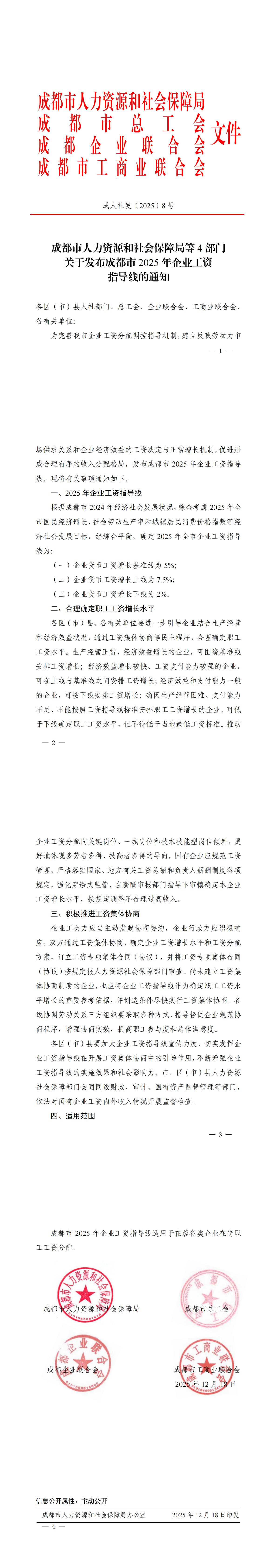 为完善我市企业工资分配调控指导机制,建立反映劳动力市场供求关系和企业经济效益的工资决定与正常增长机制,促进形成合理有序的收入分配格局,发布成都市 2025 年企业工资指导线。现将有关事项通知如下。